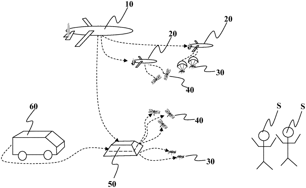 “One embodiment may configure the drone to certain length/weight scales for mobility for sample collection and/or drug delivery. For example, some may only use drones of 10 mm or less. Optionally, some may use drones that are only 5 mg or less. Some embodiments may be aggregated (like a fireworks shell) that scatter when activated. Optionally, different drones have different tasks that can self-assemble into a larger operating organism.